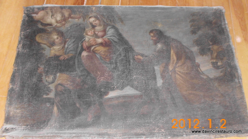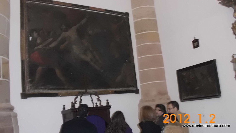 Se trata de un cuadro del siglo XVIII, de gran formato que representa » La Crucifixión». El lienzo se encuentra en muy malas condiciones ya que presenta numerosos desgarros y deformaciones en la tela, además de una capa de suciedad y barniz oxidado que oscurece la capa pictórica.