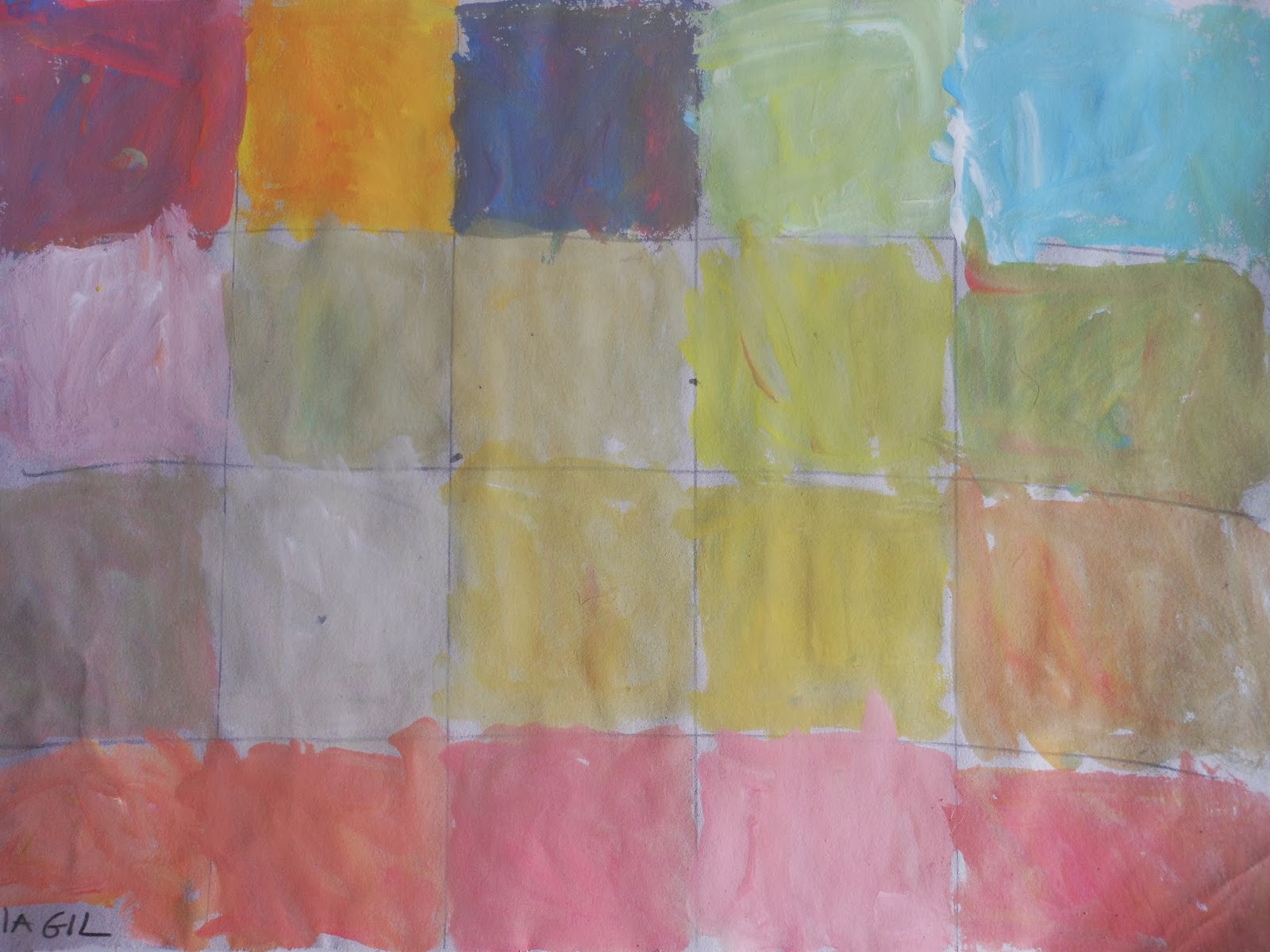 -Experiencias con las mezclas cromáticas. Las paletas tenían cuatro colores: azul, magenta, amarillo y blanco. ¿El objetivo? El puro gozo de mezclar y descubrir colores nuevos. De una forma práctica nuestros alumnos de 4 años entran en contacto con la «ley del contraste simultáneo», apreciando cómo los colores se influyen mutuamente. ¿Qué color manda aquí? ¿Cuál es el más brillante? ¿Cuál es el más oscuro? ¿Y tu favorito de los que has hecho?